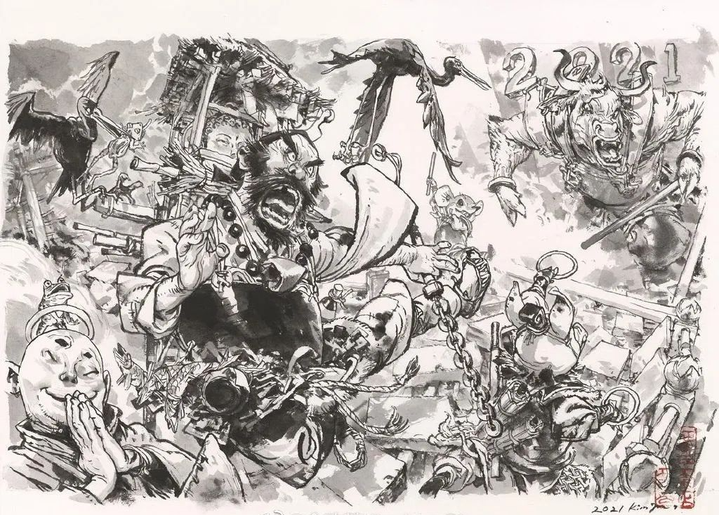 正如寺田克也說:“金政基已經(jīng)擁有了自由移動空間的能力,才能隨意將所想象的世界呈現(xiàn)得如此吸睛。”