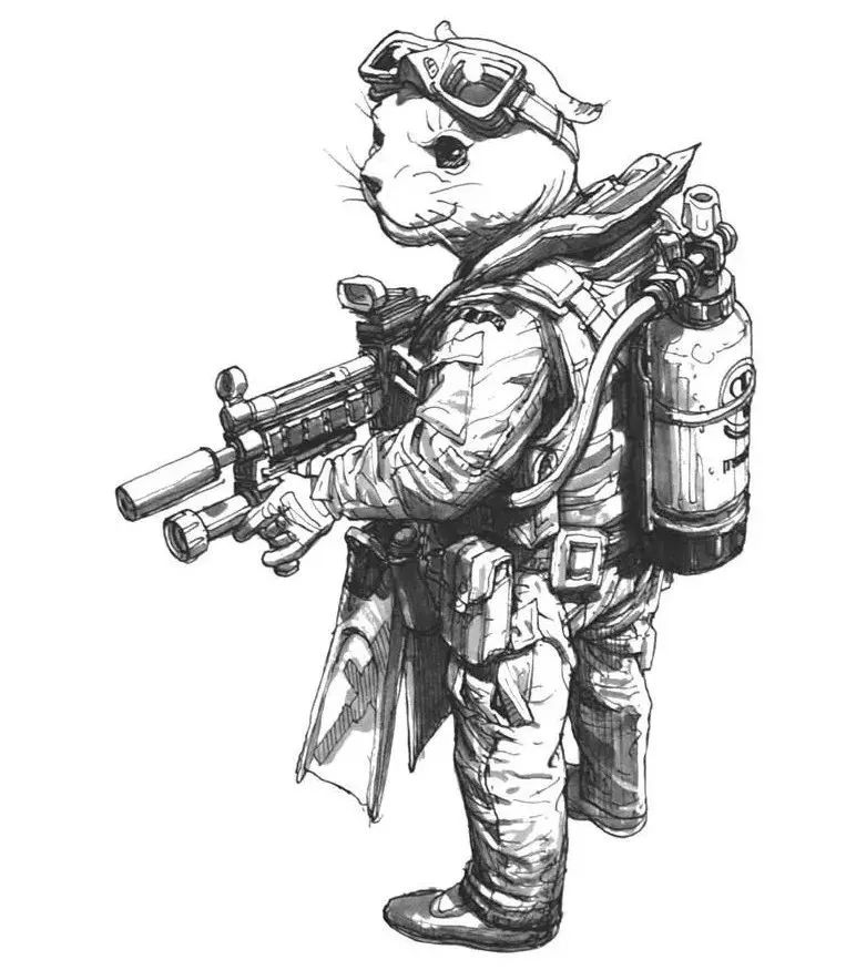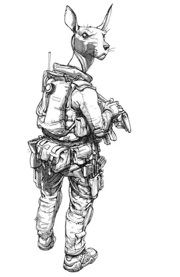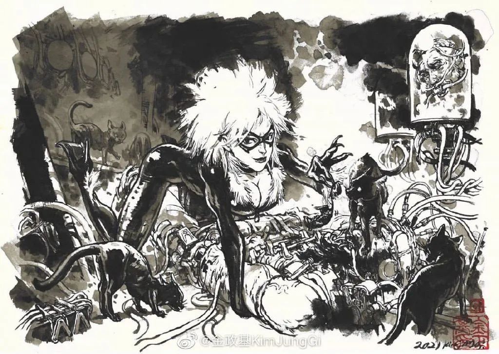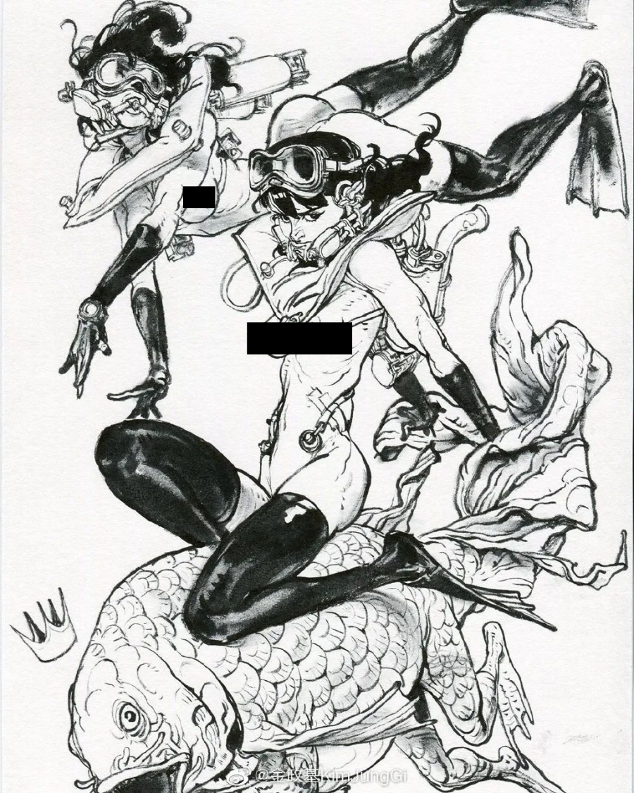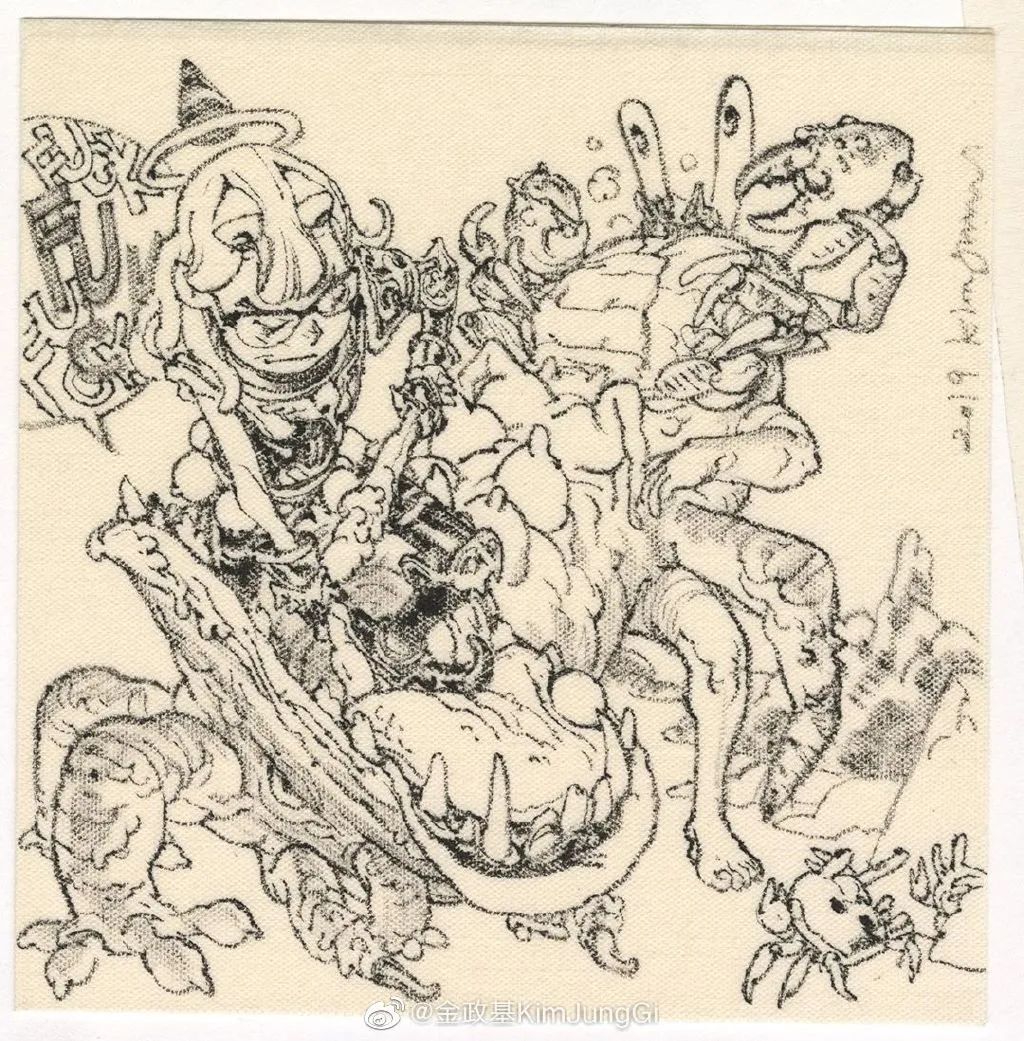 他寫實但又不止于寫實,金政基的作品,更多的是天馬行空的超現(xiàn)實主義,以及具有批判性質(zhì)的現(xiàn)實主義。因為有軍隊服役的經(jīng)歷,他尤其喜歡軍旅生活,表現(xiàn)豐富的人體,機械類以及動物題材,因此,他也受到了眾多動畫、游戲、電影等領(lǐng)域的熱捧。軍旅、惡獸與性,被認(rèn)為是最具有金政基味道的題材。