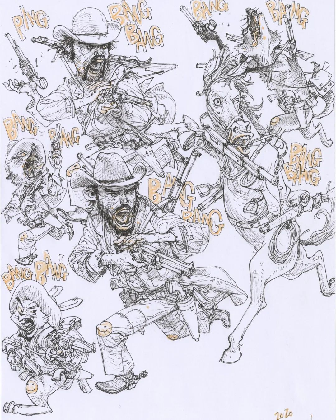 在他筆下,每個寫實的人物,表情與肢體都帶著一種豪放之氣,仰天大笑,面目猙獰的人與獸,呈現(xiàn)出了雄性的張狂與力量。比如速寫的萬圣節(jié)、圣誕節(jié),粗獷中又帶著些憨態(tài),仿佛一個來自美國西部的硬漢,橫沖直撞要將這個世界掀翻。