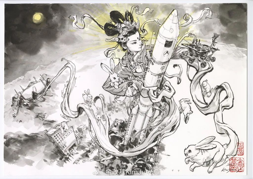 人與動物可以融合,時空可以交匯。中國航天“嫦娥一號”的發(fā)射,他畫出真的嫦娥,披著白綾,從遠(yuǎn)方飛來,攜火箭奔向高空。