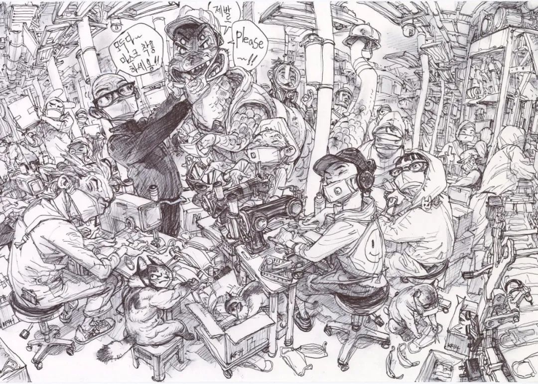 口罩工廠無論是活的生物,還是人工制品,凡是眼睛能看到的事物都是金政基的素材,皆可入畫。再由觀察生活發(fā)散,變成一幅幅超越現(xiàn)實的作品。