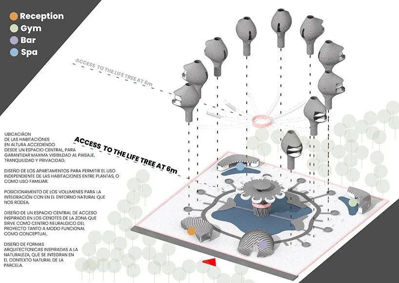 整個酒店項目圍繞著一個樹形結構向外發散展開,樹干是整個項目綜合體的中心。