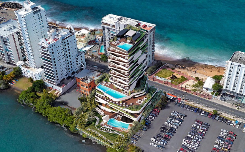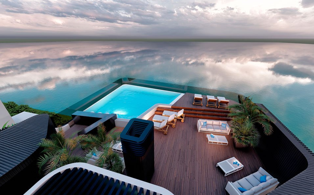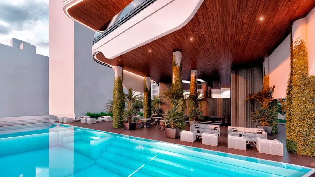 該綜合建筑提供62間豪華客房,樓層上還有超大的游泳池。